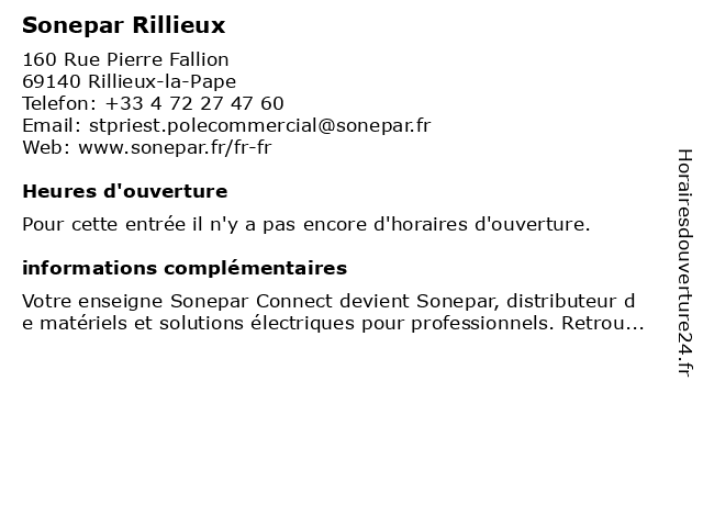 1 CLE Connect - Groupe Sonepar (Distance: 1,27 km) 14 Avenue Barthélémy Thimonnier, 69300 Caluire-et-Cuire bâtiment, cle, connect, construction, groupe, installations, services, sonepar, électricité 3 CLE - Groupe Sonepar (Distance: 8,48 km) 15 Rue Jacques Tati, 69120 Vaulx-en-Velin bâtiment, cle, construction, groupe, installations, services, sonepar, électricité 4 Sonepar Lyon Gerland (Distance: 8,51 km) 11 Rue de la Grande Famille, 69007 Lyon gerland, lyon, sonepar 6 |