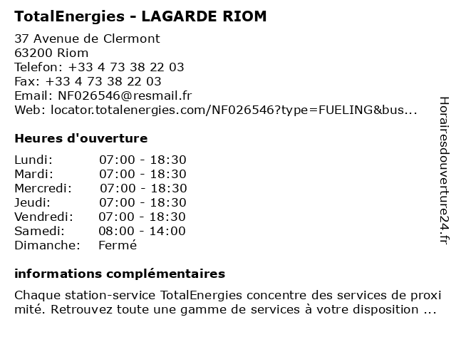 Termes de recherche pour TotalEnergies - LAGARDE RIOM:riom, total, lagarde, gas station, station service, tankstelle, totalenergies |