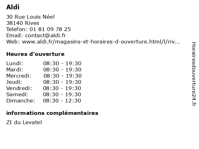 1 ALDI (Distance: 0,02 km) 30 Rue Louis Néel, 38140 Rives aldi, aldi près de moi, courses près de moi, magasin, magasin discount, magasin discount près de moi, supermarché, supermarché près de moi, supermarchés, supermarchés près de moi, épicerie, épicerie près de chez moi 2 Aldi (Distance: 19,26 km) - Rue de la Trémollière, 38120 Saint-Égrève aldi, alimentaire, alimentation, distributeur, fruits, grande distribution, hypermarché, leader, légumes, price, supermarché, supérette, épicerie 3 ALDI (Distance: 19,27 km) ZAC des Iles Rue de la Trémouillière, 38120 Saint-Égrève aldi, aldi près de moi, courses près de moi, magasin, magasin discount, magasin discount près de moi, supermarché, supermarché près de moi, supermarchés, supermarchés près de moi, épicerie, épicerie près de chez moi 4 Aldi (Distance: 23,25 km) - Rue Pierre Vincendon, 38110 La Tour-du-Pin aldi, alimentaire, courses, epicerie, fruits, price, supermarket 5 Aldi (Distance: 24,96 km) - Route de Grenoble, 38160 Saint-Sauveur aldi, alimentaire, alimentation, supermarché, supérette, épicerie 6 Aldi (Distance: 32,78 km) 59 Chemin des Sablières, 38440 Saint-Jean-de-Bournay aldi, alimentaire, alimentation, supermarché, supérette, épicerie |