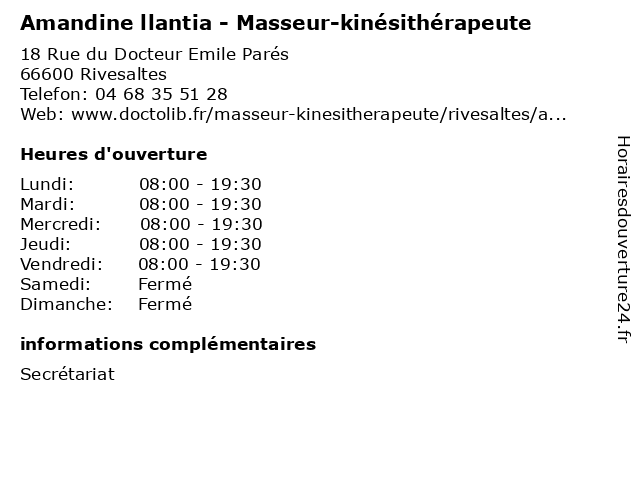 1 Cabinet de kinésiologie Grossiord Amandine (Distance: 7,32 km) 4 Square Arago, 66000 Perpignan amandine, cabinet, de, développement personnel, grossiord, kinésiologie 2 Andre-Pacouret Amandine (Distance: 11,83 km) 14 Rue Marechal Joffre, 66600 Vingrau amandine, andre, pacouret, restaurants 3 Lapoussiere Amandine Olivia (Distance: 19,00 km) Schonberg 6 Impasse Arnold, 66750 St Cyprien amandine, divers, détail, lapoussiere, magasins, nra, olivia 4 Institut Amandine (Distance: 20,15 km) 20 Boulevard Voltaire, 66200 Elne amandine, beauté, esthétique, institut, onglerie, soins 6 Dr Amandine Minaud - Médecin généraliste (Distance: 22,96 km) 3 Rue du Colonel Fabien, 66130 Ille-sur-Têt amandine, docteur, dr, generaliste, généraliste, medical, minaud, médecin, soin |