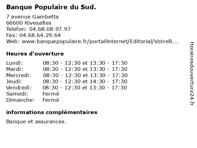 1 Banque Populaire du Sud. (Distance: 4,24 km) 131 boulevard Marius Berliet, 66000 Perpignan assurances, banque, du, populaire, sud. 2 Banque Populaire du Sud. (Distance: 6,47 km) 5 B avenue Pasteur, 66430 Bompas assurances, banque, du, populaire, sud. 3 Banque Populaire du Sud. (Distance: 8,27 km) n/a Route Nationale, 66540 Baho assurances, banque, du, populaire, sud. 4 Banque Populaire du Sud. (Distance: 8,30 km) 87 rue Pascal Marie Agasse, 66000 Perpignan assurances, banque, du, populaire, sud. 5 Banque Populaire du Sud. (Distance: 9,41 km) 449 avenue de Saint Charles, 66000 Perpignan assurances, banque, du, populaire, sud. 6 Banque Populaire du Sud. (Distance: 9,46 km) 9 rue Urbain Paret, 66250 St Laurent de la Salanque assurances, banque, du, populaire, sud. |
