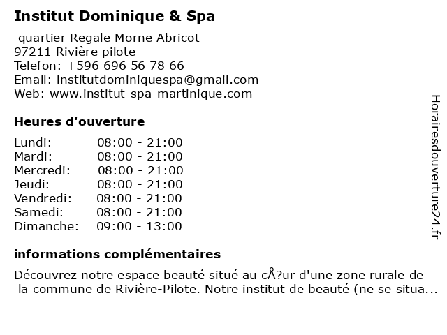 1 Bella Nails Institut (Distance: 5,43 km) . avenue des Insurections, 97211 Rivière Pilote beauté, bella, institut, nails 2 Cassiopée Spa - Espace Beauté Zen (Distance: 8,92 km) 8 Immeuble Hexagone - Espace Beauté Zen - Zone de Champigny, 97224 Ducos beauté, cassiopée, espace, esthétique, institut, salon, spa, zen 3 Hôtel Cap Est Lagoon Resort & Spa (Distance: 9,32 km) . La Prairie, 97240 Le François bar, cap, est, hotel, hôtel, lagoon, luxe, resort, restaurant, spa 4 L'Aurore Institut (Distance: 12,52 km) 35 rue Albert Camus, 97232 Le Lamentin beauté, esthétique, institut, l'aurore, manucure, onglerie, épilation 5 Hôtel Carayou & Spa (Distance: 12,58 km) . La Pointe du Bout, 97229 Trois-Ilets bar, carayou, hotel, hôtel, restaurant, spa 6 Hôtel & Spa Carayou (Distance: 14,70 km) . La Pointe du Bout, 97229 Les Trois Ilets carayou, hebergement, hotel, hôtel, spa |