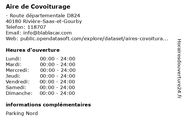 1 Aire de Covoiturage (Distance: 0,40 km) 1347 Route des Acacias, 40180 Rivière-Saas-et-Gourby aire, covoiturage, de, partager, trajets 2 Aire de Covoiturage (Distance: 1,41 km) - Chemin de Napoléon, 40180 Angoumé aire, covoiturage, de, partager, trajets 3 Aire de Covoiturage (Distance: 3,84 km) 286 Route du Cledon, 40990 Mées aire, covoiturage, de, partager, trajets 4 Aire de Covoiturage (Distance: 4,18 km) - Route departementale RD 824 - Route d'Ardy, 40990 Mées aire, covoiturage, de, partager, trajets 5 Aire de Covoiturage (Distance: 10,49 km) 1311 Avenue du Maréchal Foch, 40990 Saint-Paul-lès-Dax aire, covoiturage, de, partager, trajets 6 Aire de Covoiturage (Distance: 10,53 km) 1087 Avenue Pierre Benoît, Route de Castets, 40990 Saint-Paul-Les-Dax aire, covoiturage, de, partager, trajets |