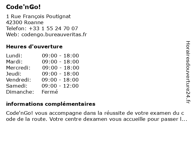 1 La Poste - Centre d'examen du code de la route (Distance: 0,52 km) 3 Rue Alexandre Roche, 42300 Roanne centre, centre d'évaluation scolaire, code, d'examen, de, du, la, poste, route, école technique 2 I.Code Roanne (Distance: 0,64 km) 64 Rue Charles de Gaulle, 42300 Roanne accessoires, boutique, i.code, mode, roanne, vêtements 3 ObjectifCode - Centre d'examen du code de la route Roanne (Distance: 0,97 km) 3 Rue Charles Peguy, 42300 Roanne centre, code, d'examen, de, du, la, objectifcode, roanne, route 4 ObjectifCode - Centre d'examen du code de la route Riorges (Distance: 1,10 km) 274 Rue Joseph Gallieni, 42153 Riorges centre, code, d'examen, de, du, la, objectifcode, riorges, route 5 La Poste - Centre d’examen du code de la route (Distance: 1,84 km) 628 Allee De La Liberation, 42153 Riorges centre, centre d'évaluation scolaire, code, de, du, d’examen, la, poste, route, école technique 6 Centre de Conduite Roannais - CCR (Distance: 1,27 km) 50 rue Brison, 42300 Roanne auto école, ccr, centre, code, conduite, cours, de, formation, permis, roannais |