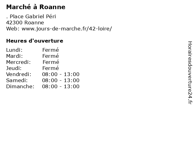 1 Marché à Roanne (Distance: 0,87 km) . Place de l'Hôtel de Ville, 42300 Roanne frutas, hortalizas, marché, mercado, roanne, verduras 2 Marché à Roanne (Distance: 0,96 km) . Place du marché, 42300 Roanne frutas, hortalizas, marché, mercado, roanne, verduras 3 Marché à Roanne (Distance: 1,30 km) . Place Georges Clemenceau, 42300 Roanne frutas, hortalizas, marché, mercado, roanne, verduras 4 Marché à Roanne (Distance: 2,01 km) . Place du Champ de foire, 42300 Roanne frutas, hortalizas, marché, mercado, roanne, verduras 5 Marché des Halles Diderot à Roanne (Distance: 0,87 km) . Ville, 42300 Roanne des, diderot, frutas, halles, hortalizas, marché, mercado, roanne, verduras 6 Marché à Le Coteau (Distance: 1,48 km) . Place Capitaine Aucey, 42120 Le Coteau coteau, frutas, hortalizas, le, marché, mercado, verduras |
