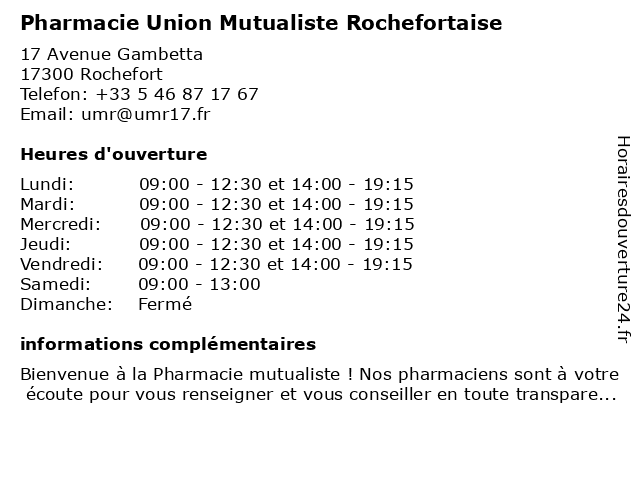 Termes de recherche pour Pharmacie Union Mutualiste Rochefortaise:union, pharmacie, mutualiste, rochefortaise |