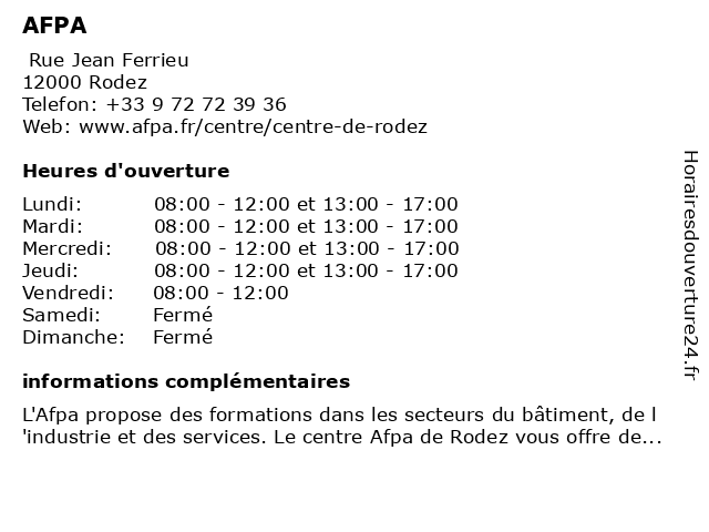 2 Afpa (Distance: 32,63 km) - Rue Alexis Monteil, 12300 Decazeville afpa, entreprise, partenaire, services 5 Afpa (Distance: 55,89 km) - Rue des Trois Buissons, 81000 Albi adultes, afpa, agence, des, entreprise, formation, la, nationale, partenaire, pour, professionnelle, services  |