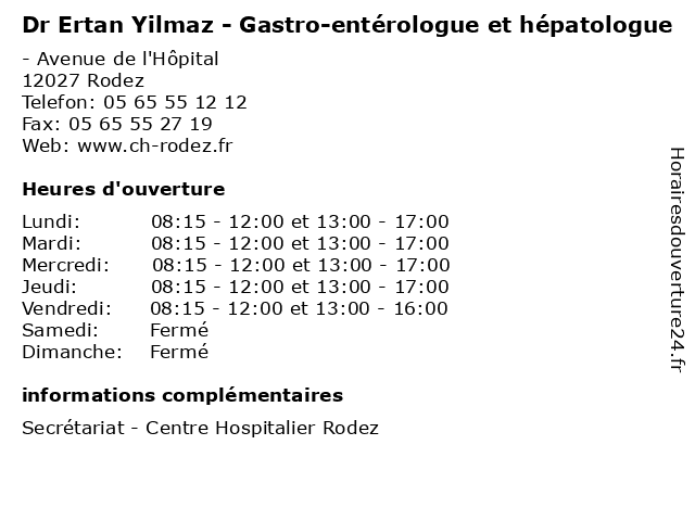 1 Dr Jean-Paul Bousquet - Gastro-entérologue et hépatologue (Distance: 0,00 km) - Avenue de l'Hôpital, 12027 Rodez bousquet, consultation, docteur, dr, entérologue, et, gastro, hépatologue, jean, med, médecin, médecine, paul, traitement 2 Dr Thierry Bruna - Gastro-entérologue et hépatologue (Distance: 0,00 km) - Avenue de l'Hôpital, 12027 Rodez bruna, consultation, docteur, dr, entérologue, et, gastro, hépatologue, med, médecin, médecine, thierry, traitement 3 Dr Patrick Castanie - Gastro-entérologue et hépatologue (Distance: 0,00 km) - Avenue de l'Hôpital, 12027 Rodez castanie, consultation, docteur, dr, entérologue, et, gastro, hépatologue, med, médecin, médecine, patrick, traitement 4 Dr Olivier Delonca - Gastro-entérologue et hépatologue (Distance: 0,00 km) - Avenue de l'Hôpital, 12027 Rodez consultation, delonca, docteur, dr, entérologue, et, gastro, hépatologue, med, médecin, médecine, olivier, traitement 5 Medecin Serge Plegat (hépatologue) (Distance: 46,83 km) 14T Avenue Jean Baptiste Calvignac, 81400 Carmaux docteur, hépatologue, medecin, plegat, sante, serge, services 6 Dr Michel Raux - Gastro-entérologue et hépatologue (Distance: 50,61 km) 36 Avenue Jean Jaures, 12100 Millau dr, enterelogue, entérologue, et, gastro, hepatolgue, hépatologue, michel, raux, soins |