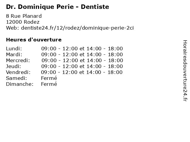1 Dr Dominique Perie - Chirurgien-dentiste (Distance: 0,02 km) 8 Rue Planard, 12000 Rodez chirurgien, consultation, dentiste, docteur, dominique, dr, med, perie, secrétariat 2 Dr Dominique Bonnecuelle - Médecin généraliste (Distance: 0,09 km) 11 Avenue Victor Hugo, 12000 Rodez bonnecuelle, consultation, docteur, dominique, dr, généraliste, med, médecin, traitement 3 Dr Dominique Gargaros - Médecin généraliste (Distance: 0,80 km) 2 Rue de l’Aubrac, 12000 Rodez docteur, dominique, dr, gargaros, generaliste, généraliste, medical, médecin, soin 4 Dr Dominique Briand - Chirurgien viscéral et digestif (Distance: 1,53 km) - Avenue de l'Hôpital, 12027 Rodez briand, chirurgien, consultation, digestif, docteur, dominique, dr, et, med, médecin, médecine, traitement, viscéral 5 Dr Dominique Lavie - Condemines - Médecin généraliste (Distance: 2,63 km) 40 Boulevard des Capucines, 12850 Onet-le-Château condemines, docteur, dominique, dr, generaliste, généraliste, lavie, medical, médecin, soin 6 Dominique Et Laurent Bastide (Distance: 10,53 km) Avenue des Evêques, 12160 Moyrazès bastide, dominique, et, laurent |