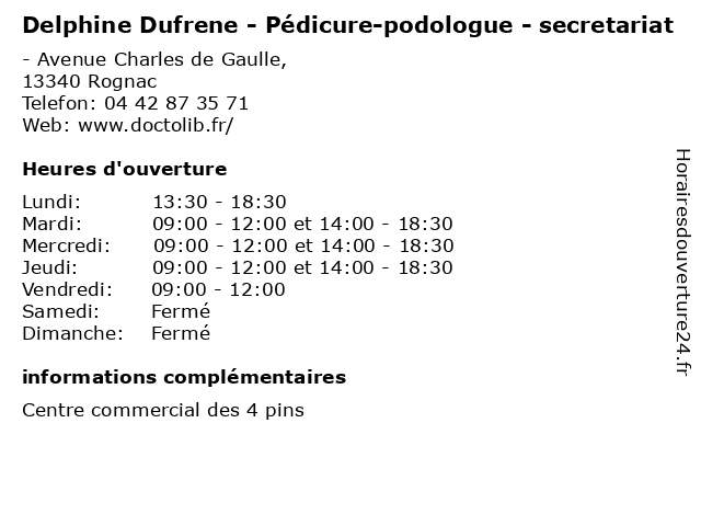 1 Céline Crapoulet-Laurent - Pédicure-podologue - secretariat (Distance: 0,00 km) - Avenue Charles de Gaulle,, 13340 Rognac crapoulet, céline, laurent, médecin, médecine, médical, pharmaceutique, podologue, podologuee, pédicure, secretariat, traitement 2 Delphine Dufrene - Pédicure-podologue - secrétariat (Distance: 0,00 km) s/n Avenue Charles de Gaulle, 13340 Rognac delphine, dr, dufrene, medical, podologue, pédicure, secrétariat 3 Estelle Michaux - Pédicure-podologue (Distance: 0,00 km) - Avenue Charles de Gaulle, 13340 Rognac estelle, michaux, orthoplastie, podologue, pédicure, pédicurie 4 Marine Benard Olivier - Pédicure-podologue - secretariat (Distance: 0,99 km) 50 Boulevard Jean Jaurès,, 13340 Rognac benard, marine, médecin, médecine, médical, olivier, pharmaceutique, podologue, pédicure, secretariat, traitement 5 Vincent Jovenin - Pédicure-podologue (Distance: 3,76 km) 39 Avenue Jules Andraud, 13880 Velaux cheville, jovenin, orteil, pied, podologue, pédicure, vincent 6 Alexandra Fialon - Pédicure-podologue - secretariat (Distance: 4,40 km) 8 Avenue Camille Pelletan,, 13127 Vitrolles alexandra, fialon, médecin, médecine, médical, pharmaceutique, podologue, pédicure, secretariat, traitement |
