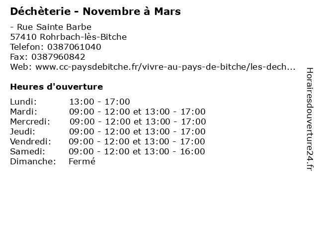 1 Déchèterie - Novembre à Mars (Distance: 10,74 km) - route de Dieding, 57905 Zetting bennes, débarras, déchèterie, détritus, mars, novembre, ordures, poubelles 2 Déchèterie - Novembre à Mars (Distance: 16,01 km) - route de Bitche, 57200 Sarreguemines bennes, débarras, déchèterie, détritus, mars, novembre, ordures, poubelles 3 Déchèterie - Novembre à Mars (Distance: 19,97 km) - impasse de la Nature, 57915 Woustviller bennes, débarras, déchèterie, détritus, mars, novembre, ordures, poubelles 4 Déchèterie - Avril à Octobre (Distance: 0,00 km) - Rue Sainte Barbe, 57410 Rohrbach-lès-Bitche avril, bennes, débarras, déchèterie, détritus, octobre, ordures, poubelles 5 Parc Archéologique Européen de Bliesbruck-Reinheim - 15 mars au 05 novembre (Distance: 11,09 km) 1 rue Robert Schuman, 57200 Bliesbruck 05, 15, archéologique, au, bliesbruck, de, européen, fouilles, mars, novembre, parc, recherches, reinheim 6 École Maternelle Publique Biculturelle Champ de Mars (Distance: 11,67 km) 4 Rue Champ de Mars, 57230 Bitche biculturelle, champ, cours, de, education, mars, maternelle, publique, services, école |