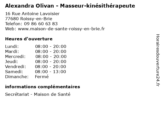 1 Dr Alexandra Lefevre - Chirurgien dentiste (Distance: 0,07 km) 5 place de la Révolution, 77680 Roissy-en-Brie alexandra, chirurgien, dentaire, dentiste, dr, implantologie, lefevre, parodontologie 2 Restaurant Du Côté de Chez Alexandra (Distance: 4,77 km) 3 Rue de la Mairie, 77185 Lognes alexandra, bar, bistro, bistrot, brasserie, café, chez, côté, de, du, restaurant, restauration 3 Université Paris Est Marne la Vallée - Bibliothèque Arts et multimédia (Alexandra David-Néel) (Distance: 6,20 km) 5 boulevard Descartes, 77454 Marne la Vallée a., alexandra, arts, arts de l'enregistrement et du spectacle, bibliothèque, david, est, et, image, la, marne, multimédia, néel, paris, son et multimédia, université, vallée 4 Charbonnier Alexandra (Distance: 9,98 km) 25 Rue D'Orgemont, 77400 Lagny-sur-Marne alexandra, charbonnier 5 Dr Alexandra Bedossa-Telfour - Pneumologue (Distance: 10,65 km) 2-4 2 Cours de la Gondoire, 77600 Jossigny alexandra, bedossa, dr, médecins, médicaments, pneumologue, santé, secrétariat, spécialiste, telfour 6 Dr Alexandra Julie - Chirurgien-dentiste - secrétariat (Distance: 12,38 km) 188 Grande Rue Charles de Gaulle, 94130 Nogent-sur-Marne alexandra, chirurgien, consultation, dentiste, docteur, dr, julie, med, médecin, médecine, secrétariat, traitement |