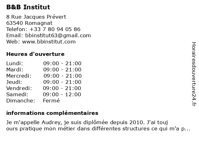 1 Ma Parenthèse Institut (Distance: 4,46 km) 11 rue de l'Hôtel de Ville, 63110 Beaumont institut, instituts de beauté, ma, parenthèse, soins esthétiques 2 L'Institut D'Isabelle (Distance: 5,51 km) . Avenue Du Général De Gaulle, 63670 La Roche Blanche d'isabelle, institut de beauté, l'institut, manucure, soins, spa, épilations 3 Institut Gamarra Cécile (Distance: 6,28 km) 1 Place Regensburg, 63100 Clermont Ferrand cécile, gamarra, institut, instituts de beauté, soins esthétiques 4 April - Parfumerie et Institut (Distance: 6,87 km) 4 Place Sully, 63400 Chamalières april, cosmetique, et, fards, institut, maquillage, parfumerie, teint, vernis 5 Institut Equilibre (Distance: 6,92 km) 13 Rue Bonnabaud, 63000 Clermont Ferrand bien-etre, brozage, equilibre, institut, spa 6 Institut 37 (Distance: 7,15 km) 37 rue des Chaussetiers, 63000 Clermont Ferrand 37, institut, instituts de beauté, soins esthétiques |