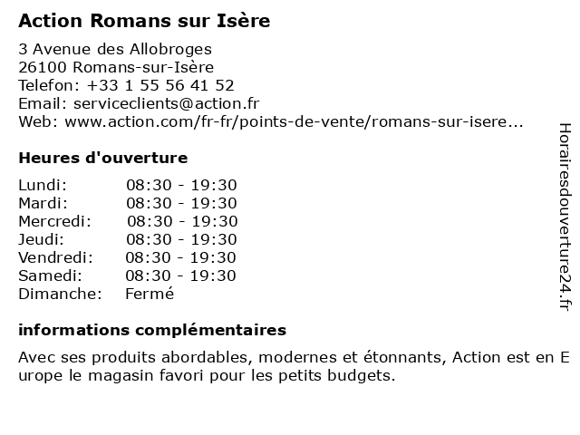 1 Action (Distance: 0,02 km) 3 Avenue des Allobroges, 26100 Romans-sur-Isère action, destockage, discount, décoration, magasin, maison, produits ménagers 2 Centre Communal d'Action Sociale (Distance: 2,27 km) 44 Rue Palestro, 26100 Romans-sur-Isère aides, ccas, centre, communal, d'action, logement, personnes âgées, prévention santé, sociale 3 Action Valence-ZAC Les Couleures Troi (Distance: 16,04 km) ZAC Les Couleures Trois, 26000 Valence action, animaux domestiques, articles de sport, articles ménagers, boissons & alimentation, bricolage, couleures, cuisine, habitat, hobby, hygiène & beauté, jardin, jouets, les, mode, multimédia, papeterie & bureau, troi, valence, voyages, zac 4 Action Tain l'Hermitage (Distance: 16,87 km) 235 Avenue des Lots, 26600 Tain l'Hermitage action, animaux domestiques, articles de sport, articles ménagers, boissons & alimentation, bricolage, cuisine, habitat, hobby, hygiène & beauté, jardin, jouets, l'hermitage, mode, multimédia, papeterie & bureau, tain, voyages 5 Agence Action Logement BOURG-LES-VALENCES (Distance: 18,79 km) 12 Avenue Marc Urtin, 26500 Bourg-lès-Valence action, agence, bourg, les, logement, valences 6 Centre Communal d'Action Sociale - CCAS (Distance: 19,10 km) 7 Avenue de Verdun, 26000 Valence action, ccas, centre, communal, d'action, sociale |