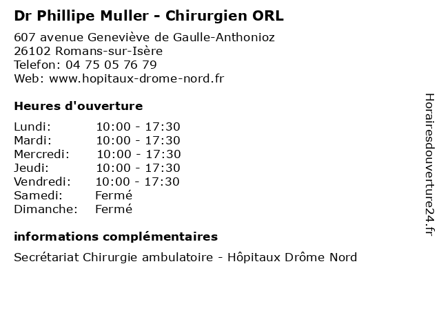 1 Dr François Labonde - Chirurgien ORL (Distance: 0,00 km) 607 avenue Geneviève de Gaulle-Anthonioz, 26102 Romans-sur-Isère ambulatoire, chirurgien, chiurgie, dr, drôme, françois, hôpitaux, labonde, nord, orl, soins 2 Dr Abdulla Saykaly - Chirurgien ORL (Distance: 0,00 km) 607 avenue Geneviève de Gaulle-Anthonioz, 26102 Romans-sur-Isère abdulla, ambulatoire, chirurgien, chiurgie, dr, drôme, hôpitaux, nord, orl, saykaly, soins 3 Dr Bruno Barlatier - Médecin ORL (Distance: 0,00 km) 607 avenue Geneviève de Gaulle-Anthonioz, 26102 Romans-sur-Isère barlatier, bruno, chirurgien, dr, drôme, générale, hôpitaux, interne, maladie, médecin, nord, orl 4 Dr Jean-Marie Guichard - ORL (Distance: 2,91 km) 23 Avenue Antonin Vallon, 26300 Bourg-de-Péage dr, guichard, jean, laryngologie, marie, orl, oto, rhino 5 Dr Olivier Runner - ORL (Distance: 13,12 km) 50 Rue des Alpes, 07300 Tournon-sur-Rhône consultation, docteur, dr, med, médecin, médecine, olivie, olivier, orl, runner, traitement 6 Dr Frédérique Bavozet - ORL (Distance: 17,00 km) 179 boulevard Maréchal Juin, 26000 Valence bavozet, consultation, docteur, dr, frederique, frédérique, med, médecin, orl, traitement |