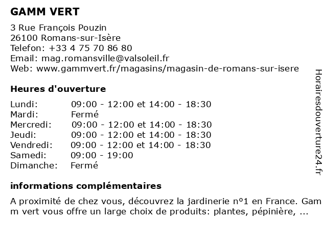 2 GAMM VERT (Distance: 10,34 km) Les Sables et les Prés Gau, 26260 Saint-Donat-sur-l'Herbasse gamm, vert 3 GAMM VERT (Distance: 10,36 km) 41 Rue du Canal, 26260 Saint-Donat-sur-l'Herbasse animalerie, gamm, jardin, jardinerie, mobilier de jardin, plantes, pépinière, vert 6 |