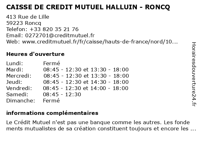 Termes de recherche pour CAISSE DE CREDIT MUTUEL HALLUIN - RONCQ:de, crédit, mutuel, caisse, roncq, halluin |