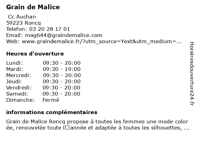 3 Grain de Malice (Distance: 16,12 km) . RN 352, 59320 Haubourdin beaute, cafe, chausures, de, enfants, grain, malice, mode femmes, mode hommes, restaurant, sport 4 Grain de Malice (Distance: 16,74 km) C Cial Auchan Englos, 59482 Englos Haubourdin Cedex de, grain, malice 5 Grain de Malice (Distance: 16,76 km) 100 Centre Commercial, 59777 Lille beaute, cafe, chaussures, de, enfants, grain, hommes, lingerie, malice, mode femmes, restaurant, sport 6 |