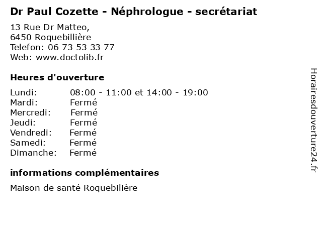 | Lundi | 08:00-11:00 et 14:00-19:00 |