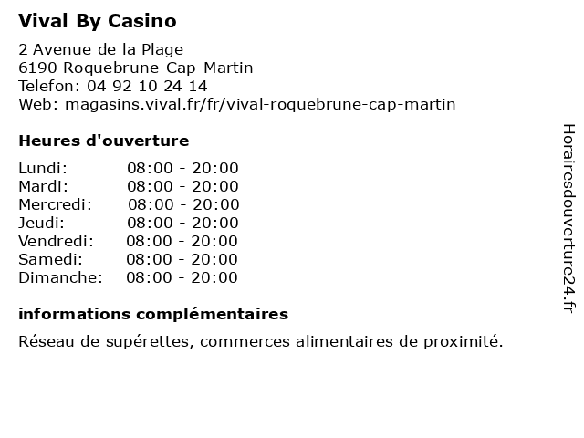 1 Vival By Casino (Distance: 4,75 km) 18 Boulevard de la République, 06240 Beausoleil alimentation, by, casino, distributeur alimentaire, supermarché, supérette, vival, épicerie 2 Vival By Casino (Distance: 16,16 km) 7 Rue Sorgentino, 06300 Nice alimentation, by, casino, distributeur alimentaire, supermarché, supérette, vival, épicerie 3 Urban Style by CL (Distance: 0,80 km) 3 Rue Albini, 06190 Roquebrune-Cap-Martin barbier, by, cl, coiffeur, coiffure, coloration, coupe, shampooing, style, urban 4 Casino shop (Distance: 0,88 km) 248 Avenue Aristide Briand, 06190 Roquebrune-Cap-Martin casino, fr, hypermarchés, magasins, shop, shop., supermarchés 5 Casino shop (Distance: 2,11 km) 4 Avenue de Thiers, 06500 Menton casino, fr, hypermarchés, magasins, shop, shop., supermarchés 6 |