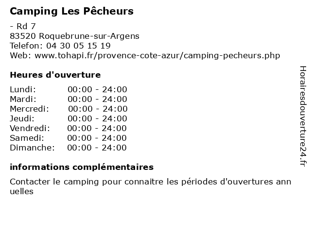 1 Camping Les Pêcheurs (Restaurant) (Distance: 0,00 km) - Rd 7, 83520 Roquebrune-sur-Argens camping, hebergement, les, pêcheurs, restaurant, tohapi, tourisme 3 Camping Les Aubrèdes (Distance: 3,78 km) 408 chemin des Aubrèdes, 83480 Puget sur Argens aubrèdes, camping, hébergement, les, tourisme 4 Camping Les Aubrèdes - Restaurant/snack (avril à septembre) (Distance: 3,78 km) 408 chemin des Aubrèdes, 83480 Puget sur Argens aubrèdes, avril, camping, hébergement, les, restaurant/snack, septembre, tourisme 5 Camping Les Aubrèdes - Réception (Distance: 3,78 km) 408 chemin des Aubrèdes, 83480 Puget sur Argens aubrèdes, camping, hébergement, les, réception, tourisme 6 Camping Le Grand Calme (Distance: 5,34 km) 1 Avenue Pierre Pujet, 83370 Fréjus calme, camping, grand, hebergement, le, tourisme |