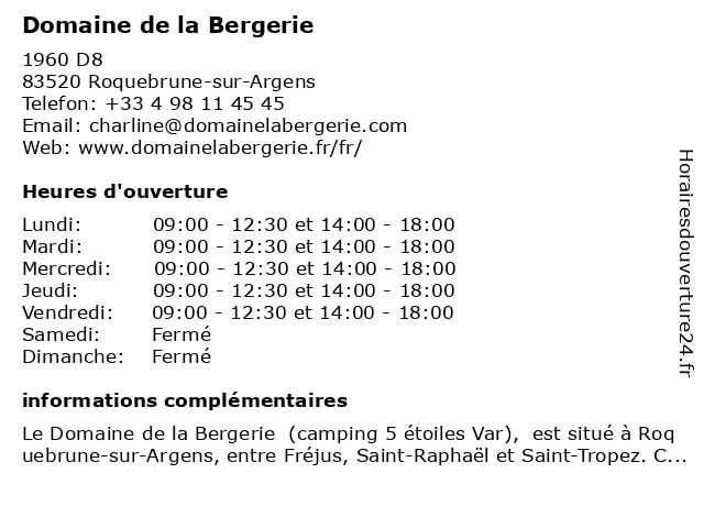 1 Domaine de la Bergerie (Distance: 0,19 km) 1960 Le Fournel, 83520 Roquebrune-sur-Argens bergerie, de, domaine, la 2 Camping Domaine de la Bergerie - Réception Octobre et Novembre (Distance: 0,00 km) 1960 route Départementale 8, 83520 Roquebrune-sur-Argens bergerie, camping, de, domaine, en, et, la, loisirs, novembre, octobre, réception, tourisme, vacances 3 Camping Domaine de la Bergerie - Réception Basse saison (Distance: 0,00 km) 1960 route Départementale 8, 83520 Roquebrune-sur-Argens basse, bergerie, camping, de, domaine, la, loisirs, réception, saison, tourisme, vacances 4 Restaurant Bar Discothèque de la Bergerie (Distance: 0,00 km) - domaine de la Bergerie, 83520 Roquebrune-sur-Argens bar, bergerie, brasserie, de, discothèque, la, menus, restaurant, restauration 5 Village vacances Ternelia - Domaine de Villepey (Distance: 3,85 km) 340 route de Roquebrune, 83370 Saint-Aygulf de, domaine, hebergement, hotel, loisirs, ternelia, tourisme, vacances, village, villepey 6 Hotel La Bergerie de Vaulongue (Distance: 10,13 km) 1520 Boulevard Jacques Baudino, 83700 Saint-Raphaël bar, bergerie, de, hotel, la, restaurant, service, vaulongue |