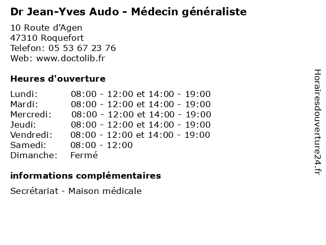 | Lundi | 08:00-12:00 et 14:00-19:00 |
