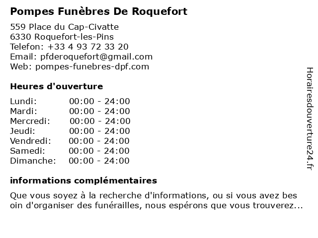 1 Le Choix Funéraire - Pompes Funèbres Duriez (Distance: 0,40 km) 559 Chemin du Plateau Fleuri, 06330 Roquefort les Pins agence, choix, duriez, décès, funèbres, funéraire, le, obsèques, pierres, pompes, tombales 2 Pompes Funébres De La Lumiére (Distance: 5,03 km) 117 Avenue des Ferrayonnes, 06270 Villeneuve-Loubet de, funébres, la, lumiére, pompes 3 Pompes Funèbres Roc-Eclerc (Distance: 6,84 km) 13 Avenue de l'Hôtel de ville, 06800 Cagnes-sur-Mer articles funéraires, assistance rapatriement, démarches admnistratives, eclerc, fleurs fraîches, funèbres, gestion des obsèques, pompes, prévoyance obsèques, roc, travaux de marbrerie et cimetière 4 Pompes Funèbres Cagnoises (Distance: 6,92 km) 23 Place Sainte-Luce, 06800 Cagnes-sur-Mer cagnoises, funèbres, pompes 5 POMPES FUNEBRES SERENITE (Distance: 6,96 km) 7 Rue Pasqualini, 06800 Cagnes-sur-Mer funebres, pompes, serenite 6 Pompes Funèbres ROBLOT (Distance: 6,99 km) 1 Rue du Chevalier Martin, 06800 Cagnes-sur-Mer avis de décès, crémation, entretien de sépulture, fleurs deuil, formalités après obsèques, funèbres, inhumation, marbrerie, monument funéraire, pompes, pompes funèbres, prévoyance obsèques, roblot |