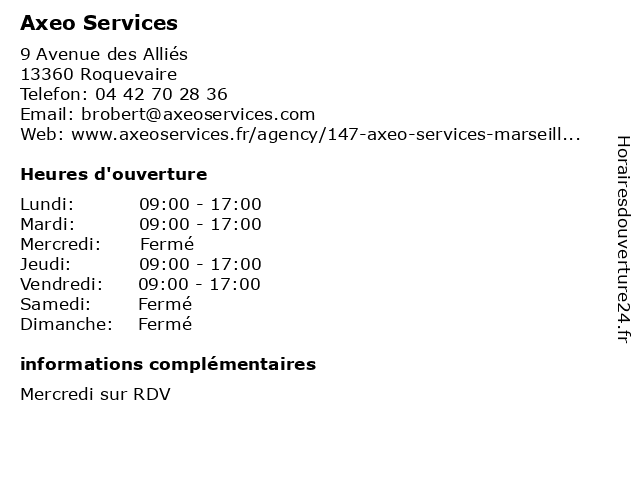 1 Axeo Services (Distance: 19,43 km) 6 Rue Maréchal Joffre, 13600 La Ciotat axeo, bricolage, services, services à la personne 3 Axeo Services (Distance: 23,77 km) 48 Boulevard Aristide Briand, 13100 Aix-en-Provence axeo, bricolage, services, services à la personne 5 Axeo Pro Services (Distance: 24,22 km) 53 Avenue Victor Hugo, 13170 Les Pennes-Mirabeau axeo, pro, services 6 Axeo Services (Distance: 34,44 km) 862 Avenue du Maréchal Juin, 83140 Six-fours-les-plages axeo, la, personne, services |