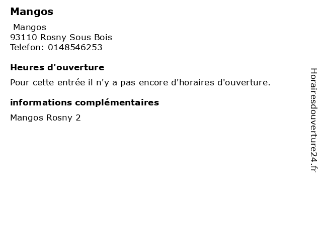 1 Mangos (Distance: 8,19 km) - le Haut de Galy, 93600 Aulnay-sous-Bois fruits, jus, mangos, restaurant, restauration 2 Mangos La Defense (Distance: 17,65 km) Centre Commercial Les 4 Temps, 92800 Puteaux defense, mangos, restaurants 3 Mangos (Distance: 22,28 km) Zac Val d Europe Zac Val Eur Ccal Serr, 77700 Serris europe, mangos, restaurants, val |