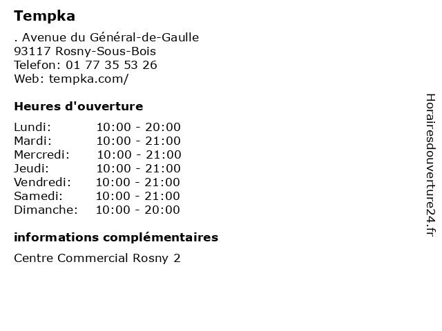 1 Tempka (Distance: 9,92 km) 101 Porte Berger, 75045 Paris chaussures, lingerie, mode enfant, mode femmes, mode hemmes, sport, tempka 2 Tempka (Distance: 10,17 km) . Avenue du Général de Gaulle, 94000 Creteil accessoires, bijoux, boutique, femme, homme, marques, montres, tempka 3 Tempka (Distance: 10,64 km) 11/13 Rue Basse, 75001 Paris accessoires, bijouterie, bijoux, marques, montres, tempka 4 Tempka (Distance: 11,00 km) 1 Cour de Rome, 75008 Paris accessoires, article, femme, homme, mode, relojeria, tempka 5 Tempka (Distance: 11,74 km) 4 Boulevard Gallieni, 92390 Villeneuve-la-Garenne accessoires, bijouterie, bijoux, cadeaux;tempka, montres, tempka 6 Tempka (Distance: 12,75 km) 30 rue des Buissons, 95718 Roissy Ch. de Gaulle bijoux, cadeaux, mode, mode femmes, montres et accessoires, shopping, tempka |
