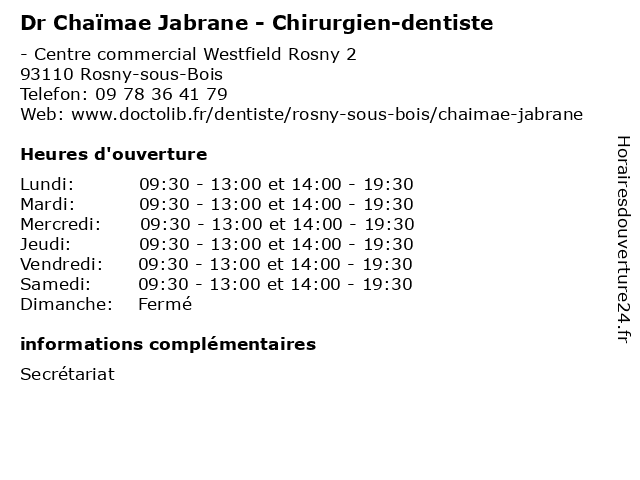 1 Dr Sabrina Mebtouche - Chirurgien-dentiste (Distance: 0,00 km) - Centre commercial Westfield Rosny 2, 93110 Rosny-sous-Bois chirurgien, dentaire, dentiste, dr, implantologie, mebtouche, parodontologie, sabrina 2 Dr Najib Khalid - Chirurgien-dentiste (Distance: 0,33 km) 2 Avenue du Général de Gaulle, 93110 Rosny-sous-Bois chirurgien, dentaire, dentiste, dr, implantologie, khalid, najib, parodontologie 3 Dr Hassan Mirghani - Chirurgien-dentiste (Distance: 0,33 km) 2 Avenue du Général de Gaulle, 93110 Rosny-sous-Bois chirurgien, dentaire, dentiste, dr, hassan, implantologie, mirghani, parodontologie 4 Dr Nadia Jean-Baptiste - Chirurgien-dentiste (Distance: 0,79 km) 194 Rue de Brément, 93130 Noisy-le-Sec baptiste, chirurgien, dentaire, dentiste, dr, implantologie, jean, nadia, parodontologie 5 Dr Hannah Marciano Dray - Chirurgien-dentiste - secretariat (Distance: 0,79 km) 118 Bis Rue Philibert Hoffmann, 93110 Rosny-sous-Bois chirurgien, dentiste, dr, dray, hannah, marciano, médecin, médecine, médical, pharmaceutique, secretariat, traitement 6 Dr Valérie Fridman - Chirurgien-dentiste (Distance: 0,95 km) 2 Rue Gay Lussac, 93110 Rosny-sous-Bois chirurgien, dentaire, dentiste, dr, fridman, implantologie, parodontologie, valerie, valérie |