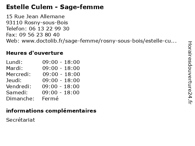 1 Estelle Masson - Sage-femme (Distance: 0,00 km) 15 Rue Jean Allemane, 93110 Rosny-sous-Bois estelle, femme, masson, medical, sage, sagefemme 2 Maître Estelle Camus - Avocate (Distance: 0,93 km) 11 Bis Rue du Général Galliéni, 93110 Rosny-sous-Bois avocate, avocats, camus, civils, droits, estelle, juridiques, maître 3 Maître Estelle Sylvestre - Avocate (Distance: 3,61 km) 30 Cours Marigny, 94300 Vincennes avocate, avocats, civils, droits, estelle, juridiques, maître, sylvestre 4 Dr Estelle Yvon - Pédiatre (Distance: 5,04 km) 48 boulevard Sérurier, 75019 Paris consultation, docteur, dr, estelle, med, médecin, pédiatre, traitement, yvon 5 Estelle Bautista - Pédicure-podologue (Distance: 5,77 km) 17 Rue Marcelin Berthelot, 93700 Drancy bautista, cheville, estelle, orteil, pied, podologue, pédicure 6 Dr Estelle Escudier - Pédiatre (Distance: 5,82 km) 26 avenue du Dr Arnold Netter, 75012 Paris consultation, docteur, dr, escudier, estelle, med, medecine, medical, médecin, pédiatre, traitement |