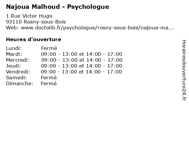 1 Maître Najoua Moulouade - Avocat (Distance: 11,15 km) 36 Boulevard Haussmann, 75009 Paris avocat, justice, lois, maitre, maître, moulouade, najoua 2 Roseline Vidot - Psychologue (Distance: 0,00 km) 1 Rue Victor Hugo, 93110 Rosny-sous-Bois psy, psychiatre, psychologue, roseline, sante, soins, vidot 3 Dr Sarah Halimi - Psychiatre (Distance: 0,25 km) 81 avenue Jean Jaurès, 93110 Rosny-sous-Bois consultation, docteur, dr, halimi, med, medecine, medical, médecin, psychiatre, sarah, traitement 4 Dr Clara Kayser - Psychiatre (Distance: 0,25 km) 81 avenue Jean Jaurès, 93110 Rosny-sous-Bois clara, consultation, docteur, dr, kayser, med, medecine, medical, médecin, psychiatre, traitement 5 Judith Mollard Palacios - Psychologue (Distance: 0,33 km) 91 Avenue Jean Jaurès, 93110 Rosny-sous-Bois folie, judith, mollard, palacios, psychiatre, psychiatrie, psychiatrique, psychologue 6 Dr Francois Pondevie - Psychiatre de l'enfant et de l'adolescent (Distance: 0,35 km) 6 Avenue de la République, 93110 Rosny-sous-Bois de, dr, et, folie, francois, l'adolescent, l'enfant, pondevie, psychiatre, psychiatrie, psychiatrique |