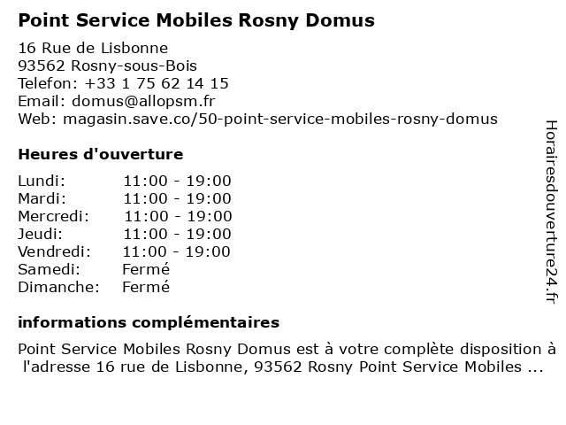 1 Centre Commercial Domus (Distance: 0,02 km) 16 Rue de Lisbonne, 93562 Rosny-sous-Bois centre, commercial, conciergerie, domus, maison, évènements 2 Decathlon Domus - Rosny sous Bois (Distance: 0,04 km) 16 Rue de Lisbonne, 93110 Rosny-sous-Bois bois, decathlon, domus, rosny, sous 4 PSM Rosny Domus (Distance: 0,07 km) 16 Rue de Lisbonne, 93110 Rosny sous bois domus, mobiles, point, psm, rosny, réparateurs, service, services, téléphonie 5 Ligne Roset Domus (Distance: 0,56 km) 16 rue de Lisbonne -, 93110 Rosny sous Bois domus, ligne, magasin, meuble, mobilier, roset 6 Point Service Mobiles (Distance: 3,18 km) 56 Avenue de la Résistance, 93340 Le Raincy mobiles, point, réparer, service, services, smartphone, tablette |