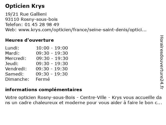 1 Opticien Krys (Distance: 3,78 km) 49 Boulevard rouget de lisle, 93100 Montreuil krys, magasin de lentilles correctrices, magasin de lunettes de soleil, opticien 2 Opticien Krys (Distance: 3,94 km) 136-138 Grande Rue, 94130 Nogent-sur-marne krys, magasin de lentilles correctrices, magasin de lunettes de soleil, magasin d’accessoires de mode, opticien, optométrie 3 Opticien Krys (Distance: 5,06 km) 28 Avenue Du Général De Gaulle, 93170 Bagnolet krys, magasin de lentilles correctrices, magasin de lunettes de soleil, magasin d’accessoires de mode, opticien, optométrie 4 Opticien Krys (Distance: 6,57 km) 55 Avenue Du Marechal Foch, 77500 Chelles krys, magasin de lentilles correctrices, magasin de lunettes de soleil, magasin d’accessoires de mode, opticien, optométrie 5 Opticien Krys (Distance: 7,16 km) 55 Rue De Menilmontant, 75020 Paris krys, magasin de lentilles correctrices, magasin de lunettes de soleil, magasin d’accessoires de mode, opticien, optométrie 6 Opticien Krys (Distance: 7,38 km) 48 Avenue du maréchal de lattre de tassigny, 94410 Saint-Maurice krys, magasin de lentilles correctrices, magasin de lunettes de soleil, opticien |