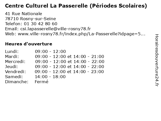 1 Centre Culturel La Passerelle (Vacances Scolaires) (Distance: 0,00 km) 41 Rue Nationale, 78710 Rosny-sur-Seine activités, centre, culturel, la, passerelle, scolaires, vacances, Évènements 2 Royal Kids (Vacances Scolaires) (Distance: 3,21 km) 1 rue des Gamelines, 78200 Buchelay enfants, horaires, kids, loisirs, parc, royal, scolaires, vacances 3 Royal Kids (Périodes Scolaires) (Distance: 3,21 km) 1 rue des Gamelines, 78200 Buchelay enfants, horaires, hors, kids, loisirs, parc, périodes, royal, scolaires, vacances 4 Aqualude (Périodes Scolaires) (Distance: 3,43 km) 38 Rue du Commandant Bouchet, 78200 Mantes-la-Jolie aqualude, aquatique, espace, piscine, périodes, récréative, scolaires 5 Aquasport (Période Scolaires) (Distance: 5,37 km) 1 Rue Jean Jaouen, 78711 Mantes-la-Ville aquasport, aquatique, espace, piscine, période, récréative, scolaires 6 Aquasport - Espace bien-être/Fitness (Période Scolaires) (Distance: 5,37 km) 1 Rue Jean Jaouen, 78711 Mantes-la-Ville aquasport, bien, espace, piscine, période, récréative, scolaires, être, être/fitness |