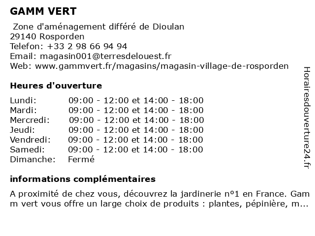 1 Gamm vert (Distance: 10,87 km) . KERGOALER, 29300 QUIMPERLE animalerie, animaux, gamm, horticulteur, jardin, jardinerie, vert 2 GAMM VERT (Distance: 12,31 km) Route de Pont-Aven, 29910 Trégunc animalerie, gamm, jardin, jardinerie, mobilier de jardin, plantes, pépinière, vert 4 GAMM VERT (Distance: 19,56 km) D61, 29510 Briec animalerie, gamm, jardin, jardinerie, mobilier de jardin, plantes, pépinière, vert 5 Votre Point Vert (Distance: 1,41 km) 2 rue Ernest Renan, 29140 ROSPORDEN animals, clothing, flower market, garden, garden tools, interior, pet, point, vert, votre 6 Gamm Vert Village (Distance: 1,52 km) Zone Artisanale de Dioulan, 29140 Rosporden gamm, vert, village |