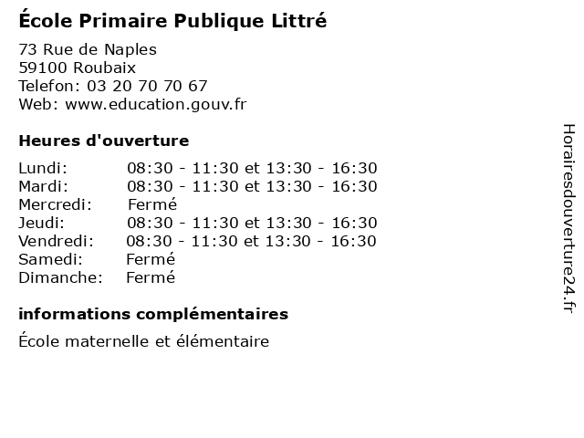 1 École Primaire Publique Littré (Distance: 11,71 km) 5 Rue Fulton, 59800 Lille cours, education, littré, primaire, publique, services, école 2 École Primaire Publique d'Application Paul Bert - Emile Littré (Distance: 40,99 km) . Rue Paul Bert, 62800 Liévin application, bert, cours, d'application, education, emile, littré, paul, primaire, publique, services, école 3 École Primaire Publique Elsa Triolet (Distance: 0,89 km) - Rue Fontenoy, 59100 Roubaix cours, education, elsa, primaire, publique, services, triolet, école 4 École primaire publique - Roubaix (Distance: 1,29 km) 34 Rue Saint Joseph, 59100 Roubaix ecole, education, maternelle, primaire, publique, roubaix, services, école 5 École Primaire Publique Lucie Aubrac (Distance: 1,43 km) 44 Rue Kléber, 59170 Croix aubrac, cours, education, lucie, primaire, publique, services, école 6 École Primaire Publique Jules Ferry (Distance: 1,67 km) 4 Rue Ternaux, 59100 Roubaix cours, education, ferry, jules, primaire, publique, services, école |