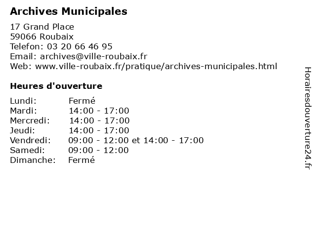 1 Archives Municipales (Distance: 2,44 km) . Place Salvador Allende, 59652 Villeneuve d'Ascq archives, archives militaires, conservation, municipales, protection des documents 2 Archives municipales (Distance: 3,06 km) 28 rue Pierre-de-Guethem, 59200 Tourcoing archives, archives militaires, conservation, municipales, protection des documents 3 Service des Archives (Distance: 9,87 km) . Place Augustin Laurent, 59033 Lille archives, archives militaires, conservation, des, protection des documents, service 4 Archives Généalogiques Andriveau (Distance: 10,46 km) 76 Boulevard Jean-Baptiste Lebas, 59000 Lille andriveau, archives, généalogiques 5 Cafe Des Archives (Distance: 12,14 km) 62 Rue Du Marechal Joffre, 59830 Bouvines archives, cafe, restaurants 6 Archives Départementales (Distance: 12,15 km) 22 Rue Saint-Bernard, 59000 Lille archives, départementales |