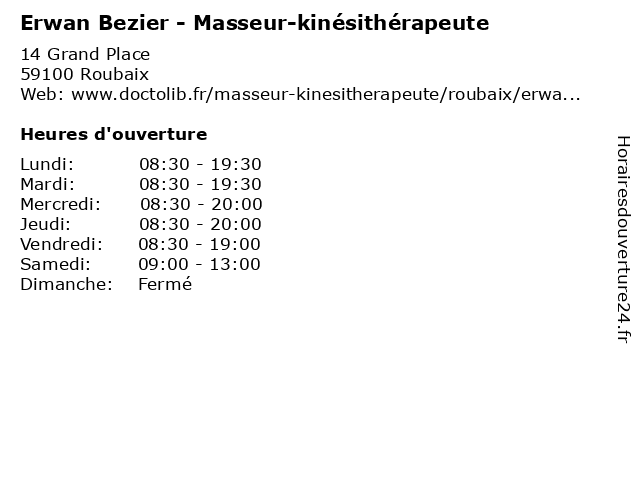 1 Maître Erwan Le Briquir - Avocat (Distance: 9,76 km) 14 rue du Sec Arembault, 59800 Lille avocat, avocats, briquir, civils, droits, erwan, juridiques, le, maître 2 Maître Erwan Sellier - Avocat (Distance: 10,53 km) 229 Rue Solférino, 59000 Lille avocat, erwan, justice, lois, maitre, maître, sellier 3 Erwan Godde - Masseur-kinésithérapeute (Distance: 20,64 km) 16 Rue du Maréchal Foch, 59280 Armentières bien-être, en, erwan, forme, godde, kinésithérapeute, kinésithérapie, masseur, remise, rééducation 5 Vv Evenement (Distance: 45,40 km) Avenue De Verdun, 59300 Valenciennes erwan, evenement, restaurants, verpillon, villeneuve, vv 6 Matthieu Debever - Masseur-kinésithérapeute (Distance: 0,00 km) 14 Grand Place, 59100 Roubaix debever, docteur, kine, kinesitherapeute, kinésithérapeute, masseur, matthieu |