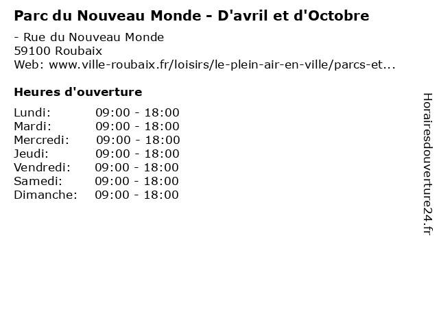 1 Parc du Nouveau Monde - De Novembre à Mars (Distance: 0,00 km) - Rue du Nouveau Monde, 59100 Roubaix arbre, de, du, espace vert, forêt, jardin, loisirs, mars, monde, nature, nouveau, novembre, parc, prairie, square 2 Parc du Nouveau Monde - De Mai à Septembre (Distance: 0,00 km) - Rue du Nouveau Monde, 59100 Roubaix arbre, de, du, espace vert, forêt, jardin, loisirs, mai, monde, nature, nouveau, parc, prairie, septembre, square 3 Jardins de l'Hommelet - D'avril et d'Octobre (Distance: 0,39 km) - Rue de la Vigne, 59100 Roubaix arbre, d'avril, d'octobre, de, espace vert, et, forêt, jardin, jardins, l'hommelet, loisirs, nature, parc, prairie, square 4 Le parc du Nouveau Monde - les mois d'avril et d'octobre (Distance: 0,44 km) 153 Rue de l'Hommelet, 59100 Roubaix arbre, d'avril, d'octobre, du, espace vert, et, forêt, jardin, le, les, loisirs, mois, monde, nature, nouveau, parc, prairie, square 5 Jardins des Récollets - D'avril et d'Octobre (Distance: 0,48 km) - Rue des Récollets, 59100 Roubaix arbre, d'avril, d'octobre, des, espace vert, et, forêt, jardin, jardins, loisirs, nature, parc, prairie, récollets, square 6 Jardins de l'Alma - D'avril et d'Octobre (Distance: 0,68 km) - Rue de la Chaussée, 59100 Roubaix arbre, d'avril, d'octobre, de, espace vert, et, forêt, jardin, jardins, l'alma, loisirs, nature, parc, prairie, square |