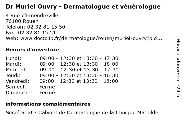 1 Dr Catherine Kerbrat - Dermatologue et vénérologue (Distance: 0,00 km) 4 Rue d'Emendreville, 76100 Rouen catherine, consultation, dermatologue, docteur, dr, et, kerbrat, med, médecin, médecine, secrétariat, traitement, vénérologue 2 Dr Emilie Chartaux - Dermatologue et vénérologue (Distance: 0,00 km) 4 Rue d'Emendreville, 76100 Rouen chartaux, consultation, dermatologue, docteur, dr, emilie, et, med, médecin, médecine, secrétariat, traitement, vénérologue 3 Dr Sylvie Bechu - Dermatologue et vénérologue (Distance: 0,00 km) 4 Rue d'Emendreville, 76100 Rouen bechu, consultation, dermatologue, docteur, dr, et, med, médecin, médecine, secrétariat, sylvie, traitement, vénérologue 4 Dr Muriel Rives - Ophtalmologue (Distance: 0,16 km) 7 Boulevard de l'Europe, 76100 Rouen clinique, dr, mathilde, muriel, ophtalmologie, ophtalmologistes, ophtalmologue, rives, rouen, vision 5 Dr Muriel Piat - Radiologue (Distance: 1,48 km) 37 boulevard Gambetta, 76000 Rouen charles, de, diagnostique, dr, hôpital, imagerie, muriel, nicolle, piat, radiologie, radiologue, rouen, thérapeutique 6 Dr Muriel Leroy - Médecin généraliste (Distance: 3,93 km) 26 Rue Racine, 76120 Le Grand-Quevilly docteur, dr, generaliste, généraliste, leroy, medical, muriel, médecin, soin |