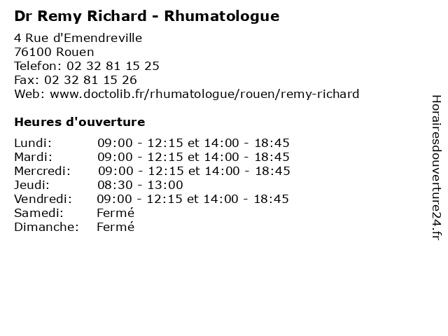 1 Dr Rémy Richard - Rhumatologue (Distance: 0,02 km) 4 Rue d'Emendreville, 76100 Rouen clinique, dr, locomoteur, mathilde, rhumatologie, rhumatologue, rhume, richard, rouen, rémy 2 Richard Clautiaux - Psychologue (Distance: 0,15 km) 4 Rue de Lessard, 76100 Rouen clautiaux, psy, psychiatre, psychologue, richard, sante, soins 3 Dr Laetitia Richard - Rhumatologue (Distance: 1,47 km) 37 boulevard Gambetta, 76000 Rouen charles, de, dr, hôpital, laetitia, locomoteur, nicolle, rhumatologie, rhumatologue, rhume, richard, rouen 4 Alissone Richard - Sage-femme (Distance: 2,31 km) 142 Route de Darnétal, 76000 Rouen alissone, femme, medical, richard, sage, sagefemme 5 Librairie Richard Simon (Distance: 2,53 km) 43 Route de Neufchâtel, 76000 Rouen librairie, richard, simon 6 Dron Richard Andre Francois (Distance: 3,84 km) 65 Rue Sadi Carnot, 76160 Darnetal andre, boucheries, dron, francois, poissonneries, richard |