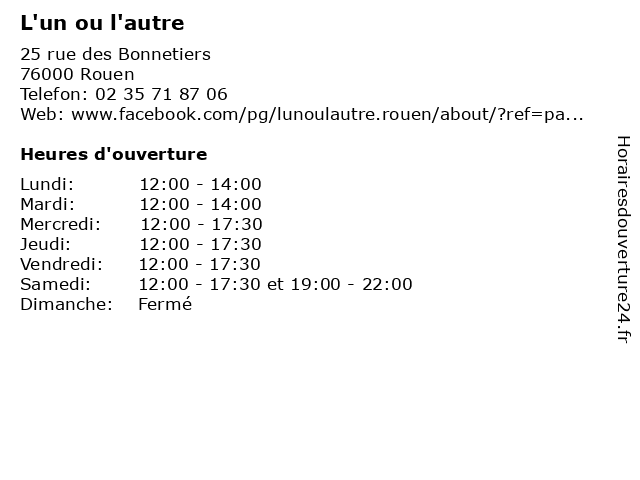 | Samedi | 12:00-17:30 et 19:00-22:00 |
