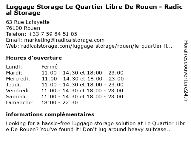 1 Radical Storage - Lugagge Storage Near Joffre-mutualite (Distance: 0,00 km) 63 Rue Lafayette, 76100 Rouen joffre, lugagge, luggage storage, luggage storage near me, mutualite, near, radical, storage 2 Luggage Storage Joffre-Mutualite - Radical Storage (Distance: 0,25 km) 22 Rue Saint-Sever, 76100 Rouen joffre, luggage, luggage storage, luggage storage near me, mutualite, radical, storage 3 Luggage Storage Rouen Cathedral - Radical Storage (Distance: 0,72 km) 29 Rue de la Tour de Beurre, 76000 Rouen cathedral, luggage, luggage storage, luggage storage near me, radical, rouen, storage 4 Nannybag Luggage Storage (Distance: 1,09 km) 55 Rue De La République, 76000 Rouen luggage, nannybag, storage 6 |
