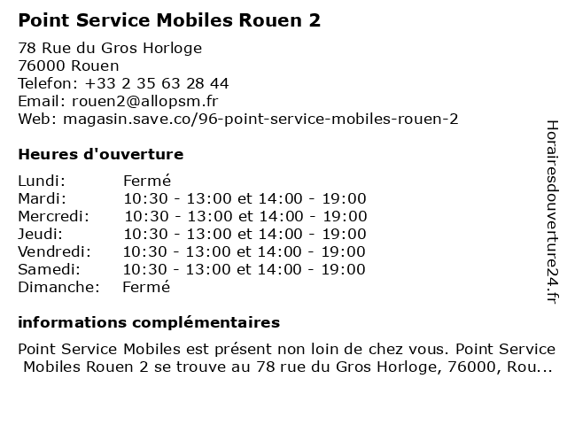 | Samedi | 10:30-13:00 et 14:00-19:00 |