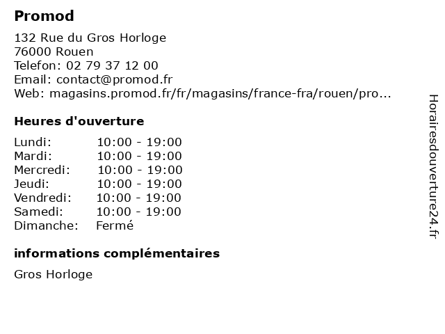 1 Promod (Distance: 1,24 km) n/c Avenue De Bretagne, 76000 Rouen femme, jeans, mode, pantalons, promod, tendances, vetements 2 Promod (Distance: 1,83 km) 9 Boulevard Ferdinand De Lesseps, 76000 Rouen femme, jeans, mode, pantalons, promod, tendances, vetements 3 Promod (Distance: 2,93 km) 2 Rue Du General Foy, 42000 Saint Etienne femme, homme, jupes, promod, robes, t-shirts, tops 4 Promod (Distance: 12,54 km) 2 Avenue Gustave Picard, 76410 Tourville-la-Riviere femme, jeans, mode, pantalons, promod, tendances, vetements 5 Promod (Distance: 13,83 km) . Rue Du 19 Mars 1962, 76360 Barentin alimentation, beauté & santé, culture & loisirs, enfants, high-tech, mode, promod, restaurants 6 Promod (Distance: 48,23 km) - Route Nationale 13, 27930 Guichainville femme, jeans, mode, pantalons, promod, tendances, vetements |