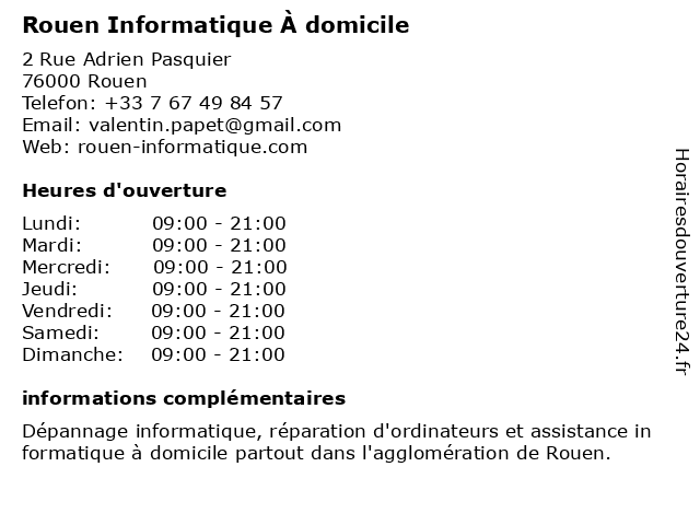 1 Domicile Clean (Distance: 0,40 km) 34 Rue du Faubourg Martainville, 76000 Rouen clean, domicile, enfants, garde, ménage 3 Dr. Le Véto Normand à Domicile - Vétérinaire (Distance: 0,87 km) 10 Rue du Tambour, 76000 Rouen docteur, domicile, dr., le, medecins, normand, sante, véto, vétérinaire 4 Ménage et repassage à domicile - Shiva Rouen (Distance: 0,96 km) 78 Rue aux Ours, 76000 Rouen domicile, et, ménage, repassage, rouen, shiva 5 Petits-fils Rouen Bonsecours - Aide à domicile (Distance: 0,99 km) 177 Boulevard de l'Yser, 76000 Rouen aide, bonsecours, domicile, fils, petits, rouen 6 Ouihelp Rouen - Aide à domicile (Distance: 0,99 km) 7 Rue Jeanne d'Arc, 76000 Rouen aide, domicile, ouihelp, rouen |
