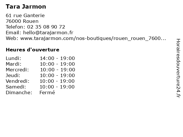 1 Tara Jarmon (Distance: 0,32 km) 4-14 rue du Gros Horloge, 76000 Rouen accessoires, jarmon, magasin, mode, prêt à porter, tara, vêtements 3 11h11 - Concept Store (Distance: 0,34 km) 6 rue de l'Hôpital, 76000 Rouen 11h11, accessoires, chaussures, concept, createurs, mode, store, vetement 4 La Halle Aux chaussures (Distance: 0,82 km) . Place Saint-Marc, 76046 Rouen aux, chaussures, femme, halle, homme, la, magasin, vetement 5 La Halle aux Chaussures (Distance: 4,74 km) 42 Rue de la République, 76250 Déville-lès-Rouen aux, chaussures, femme, halle, homme, la, magasin, vetement 6 Tally Weijl (Distance: 12,97 km) 2 parvis des Senteurs, 76360 Pissy-Poville accessoires, jupe, marque, mode, pantalon, pull, robe, saisons, style, suisse, tally, tshirt, vetement, weijl |